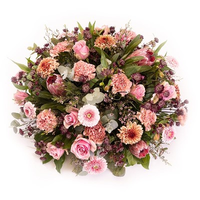 Fra blød pink til dyb lilla, dette farverige, men alligevel værdige arrangement hylder dine kære følsomt, mens det anerkender de glade minder, der aldrig vil blive glemt. Denne smukt udformede båredekoration tilbyder enestående værdi og sikrer en hjertelig og overkommelig hyldest til at ære din elskede. Dette begravelsesarrangement er subtilt iøjnefaldende og balancerer kølige hvide roser med levende stænk af rustikt grønt. Et enkelt, elegant tegn på sympati.
